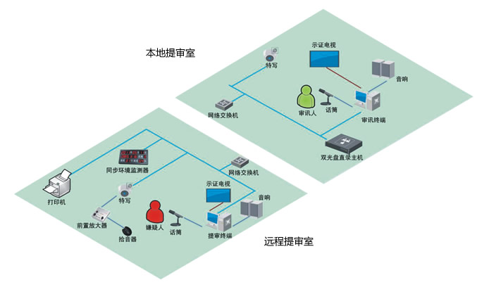 远程提审系统,即对嫌疑人或证人的整个询问过程通过网络视频、远程监控等高科技手段,建立声音、视频远程网络传输,并将整个询问过程进行全程录音录像,制作成光盘保存。在现场或远程对审讯过程实时监控、指挥,可实现多方协同方案。这种办案方式为简单案件异地审核提供了方便,解决了办案效率;同时也为社会各界提供了一种日益公开、民主、便捷、高效而新型的交流平台;针对疑难案件,主管领导或相关专家更可以随时对案件进行远程指导,案件办理的质量也随之提高。
