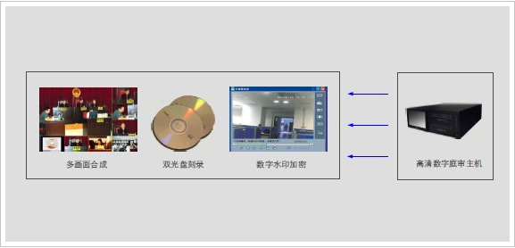 庭审主机采用高清刻录,刻录之前系统自动校验光盘质量和容量,及时提醒用户光盘当前的状况,并具有换盘自动记忆刻录点、坏盘重新刻录等强大的功能,为庭审系统提供清晰完整的同步录音录像证据,有效解决了因清晰度或刻录故障致使同步录音录像资料无效或缺失的问题。