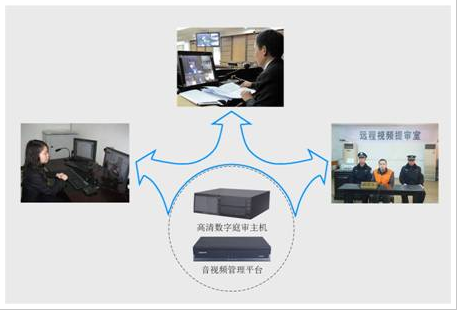法庭审判人员可以通过网络对犯罪嫌疑人进行远程审判,即法官、书记员等人在本地的法庭,通过庭审系统的远程功能,或者利用视频会议系统,实现与远端的犯罪嫌疑人的双向语音、视频互通。